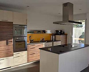 - Offene Wohnküche mit Mikrowellen-Backofen-Kombigerät, Glaskeramikherd, Geschirrspüler